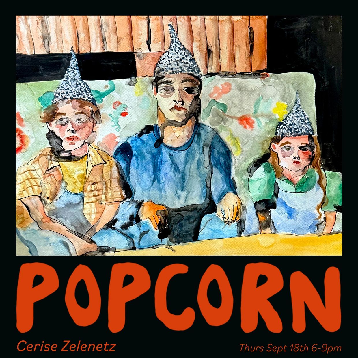 Pulling from the world of cinema Popcorn takes the viewer through the archives of pop culture. The work, though referential, takes on a life of its own through bold watercolors and the confident gestures of the line work.
